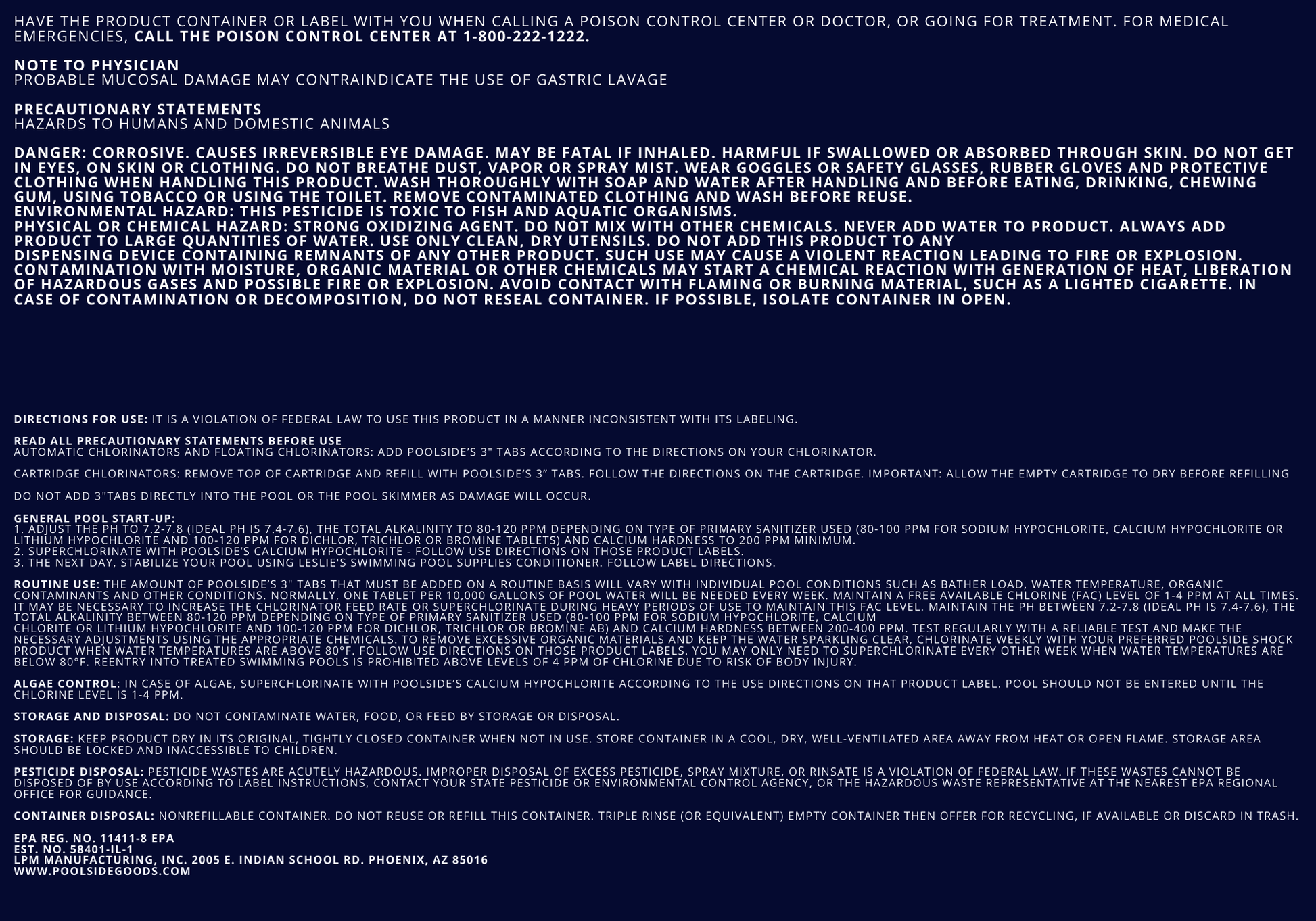 Poolside - 3 Inch Chlorine Tabs - 50lb Container, Plastic Lined